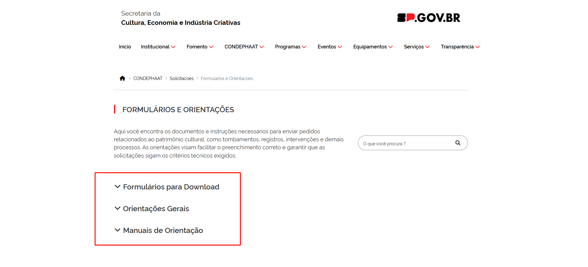 b) Seguir orientações do manual disponível na aba “Formulários e Orientações” na página do Portal da Cultura do Condephaat - Formulários e Orientações